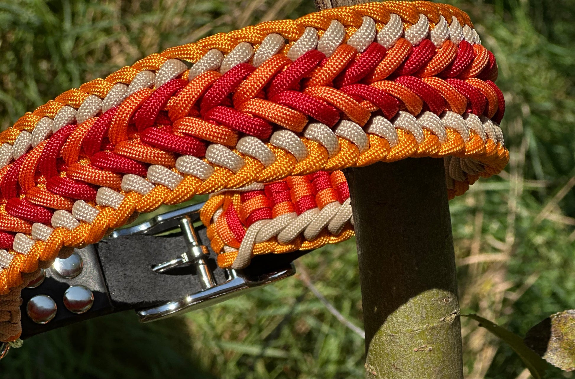 Dieses Paracord Halsband in der Technik "Stubborn" überzeugt durch seine besonders dichte, mehrlagige Flechtung und eine markante, hochwertige Optik. Die aufwendig gearbeiteten Knoten sorgen für außergewöhnliche Stabilität und eine angenehme Polsterung am Hals.